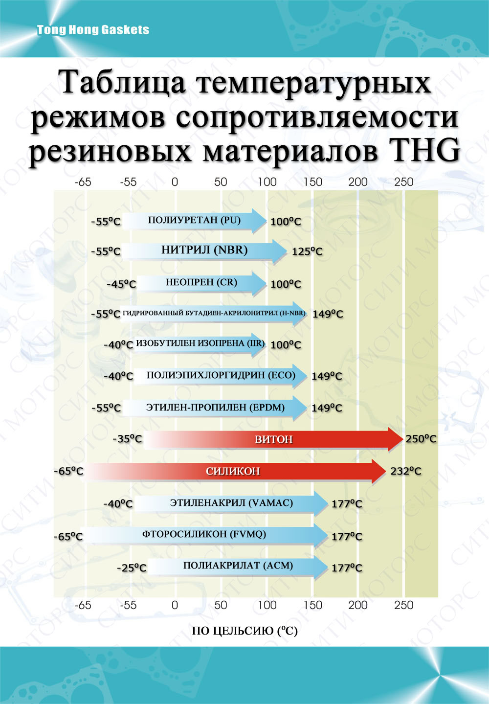 Резинотехнические материалы так же имеют различные свойства и разное качество. Сальники в поставляемых нам ремкомплектах двигателя изготовлены из материала “Silicone (Силикон)”, маслосъемные колпачки клапанов из материала “Vitone (Витон)” в отличие от материалов “NBR (НБР)” и “Acryll (Акрилл)”, которые применяются в ремкомплектах практически всех других заводов и продающихся сейчас в магазинах. Материалы “Silicone (Силикон)” и “Vitone (Витон)” имеют хорошую эластичность и большую резистентность к высоким и низким температурам, что позволяет сохранять работоспособность резиновым деталям из этих материалов даже при перегреве двигателя и сохранять свои свойства в сильные морозы. Смотрите разницу сопротивляемости материалов для разных температур в таблице резистентности резиновых материалов. Например, маслосъемные колпачки (сальники) клапанов из материала «Витон» выдерживают температуру до +250 градусов Цельсия, в отличие от маслосъемных колпачков (сальников) из материала “НБР”, которые выдерживают температуру до + 125 градусов Цельсия. Это значит, что при перегреве двигателя маслосъемные колпачки из материала Витон не потребуется менять. На упаковках маслосъемных колпачков, в том числе и в ремкомплектах двигателей, имеется надпись о материале - “Viton”.